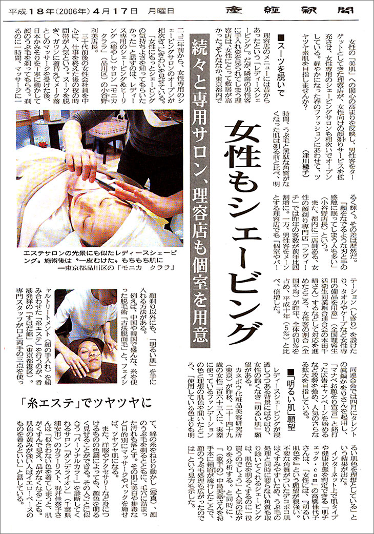 女性の「美肌」への関心の高まりを反映し、男性客をターゲットとしてきた理容店が、女性向けの顔剃(そ)りサービスを拡充させ、女性専用のシェービングサロンも相次いでオープンしている。軽やかになった春のファッションにあわせて、ツヤツヤ素肌を目指しませんか?